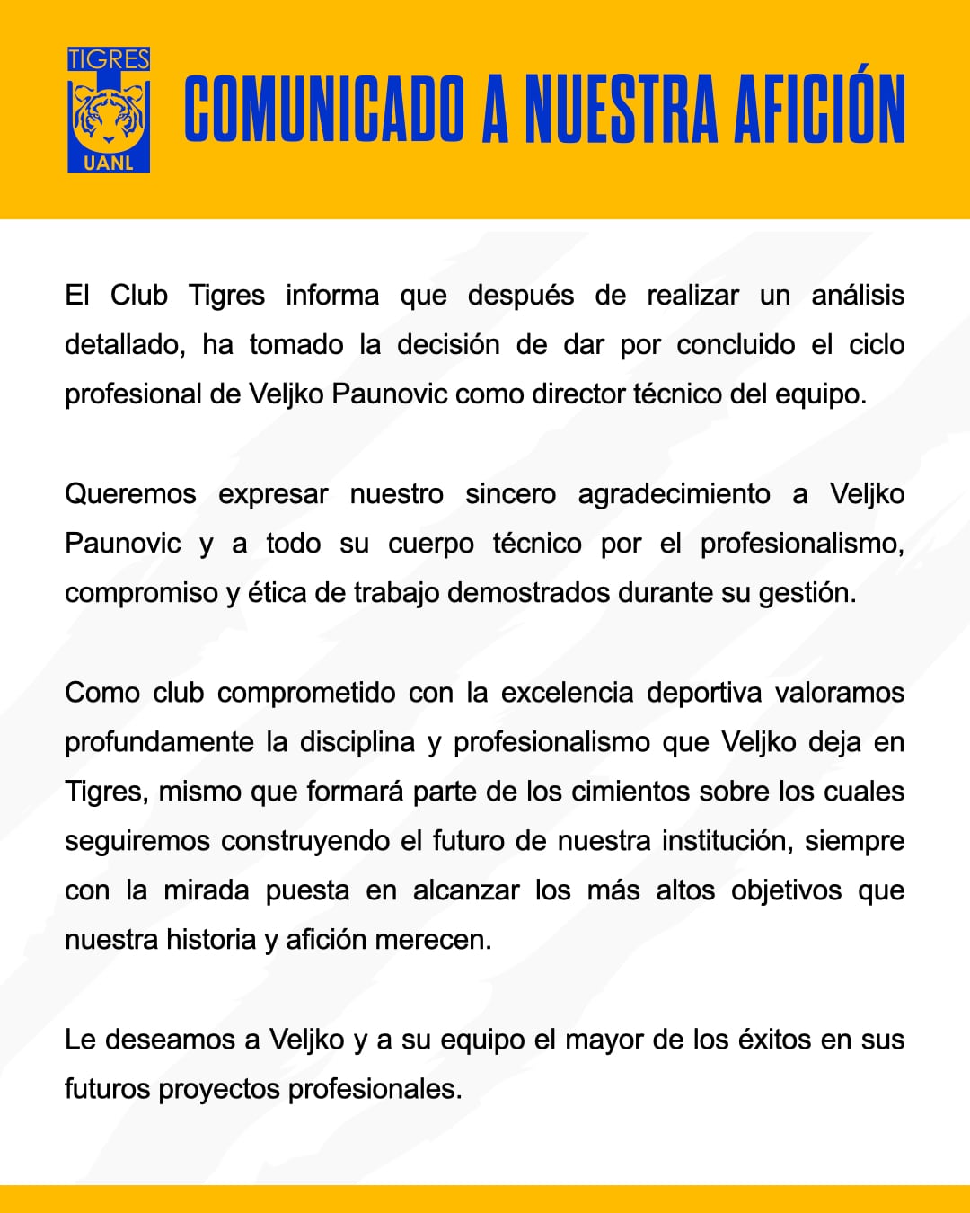 A través de un comunicado compartido en sus redes sociales, el Club Tigres hizo oficial la salida de Veljko Paunovic.