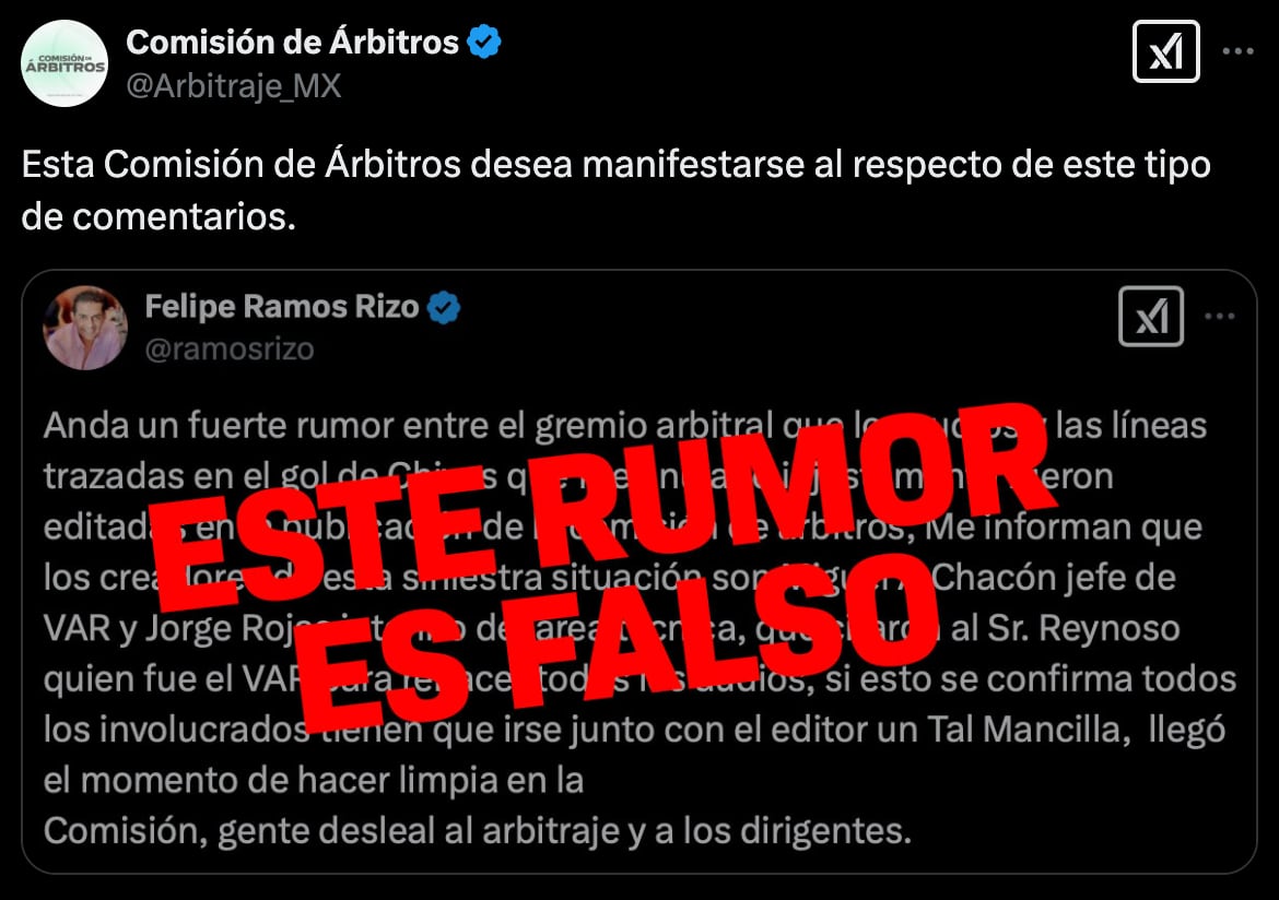 “Anda un fuerte rumor entre el gremio arbitral que los audios y las líneas trazadas en el gol de Chivas que fue anulado injustamente fueron editadas en la publicación de la comisión de árbitros, Me informan que los creadores de esta siniestra situación son Miguel A Chacón jefe de VAR y Jorge Rojas interino del área técnica, que citaron al Sr. Reynoso quien fue el VAR para rehacer todos los audios, si esto se confirma todos los involucrados tienen que irse junto con el editor un Tal Mancilla, llegó el momento de hacer limpia en la Comisión, gente desleal al arbitraje y a los dirigentes”, escribió el ex árbitro en su cuenta de X.