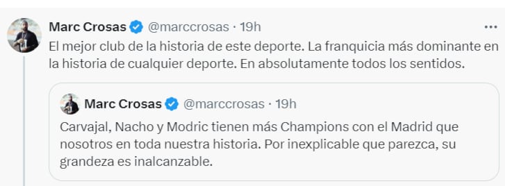 Y es que en su cuenta de X, antes Twitter, Marc Crosas aseguró que el Real Madrid es “el mejor club de la historia de este deporte. La franquicia más dominante en la historia de cualquier deporte. En absolutamente todos los sentidos”.