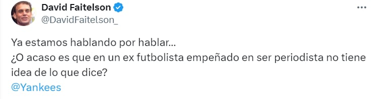 “Ya estamos hablando por hablar…¿O acaso es que un ex futbolista empeñado en ser periodista no tiene idea de lo que dice?”, escribió David Faitelson.