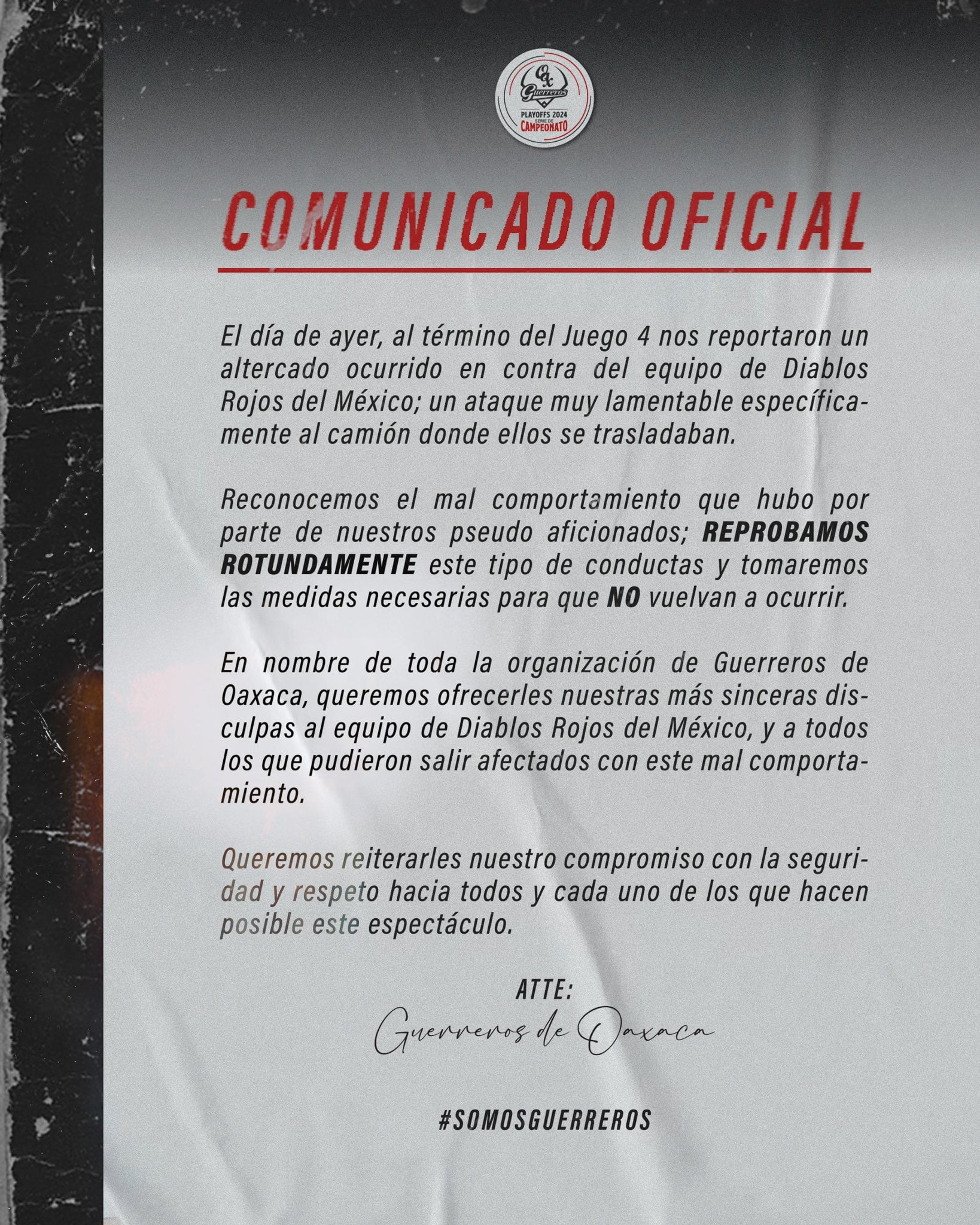 En nombre de toda la organización de Guerreros de Oaxaca, queremos ofrecerles nuestras más sinceras disculpas al equipo de Diablos Rojos del México y a todos los que pudieron salir afectados con este mal comportamiento”.