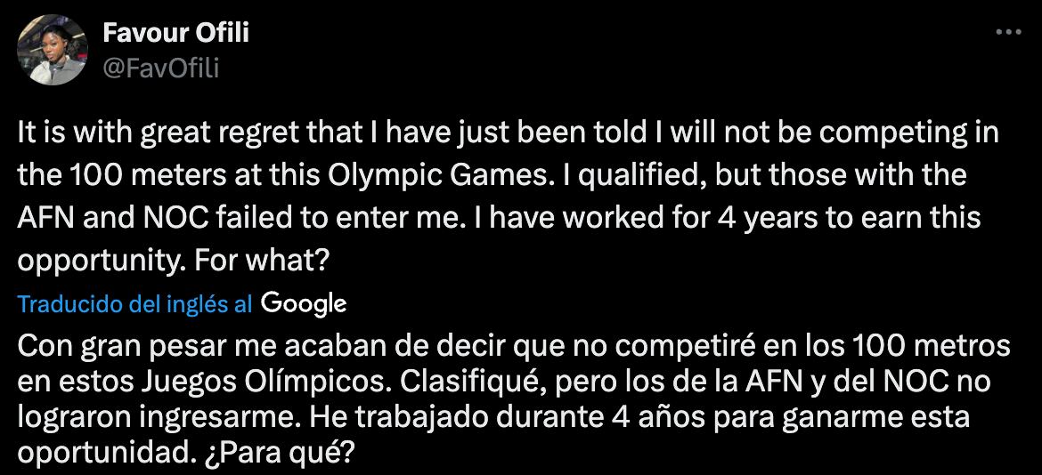“Con gran pesar me acaban de decir que no competiré en los 100 metros en estos Juegos Olímpicos. Clasifiqué, pero los de la AFN y del NOC no lograron inscribirme. He trabajado durante 4 años para ganarme esta oportunidad. ¿Para qué?”, escribió en su cuenta de X.