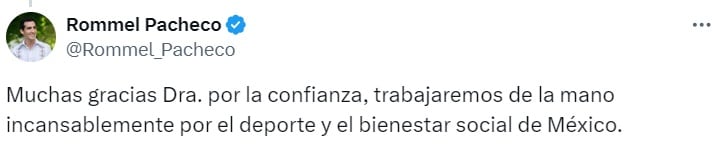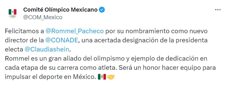 “Felicitamos a Rommel Pacheco por su nombramiento como nuevo director de la Conade, una acertada designación de la presidenta electa Claudia Sheinbaum.