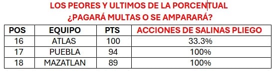 Según el reglamento de competencia impuesto por la Federación Mexicana de Futbol, los tres equipos tendrán que pagar la multa si es que no suben de puesto en la lista.