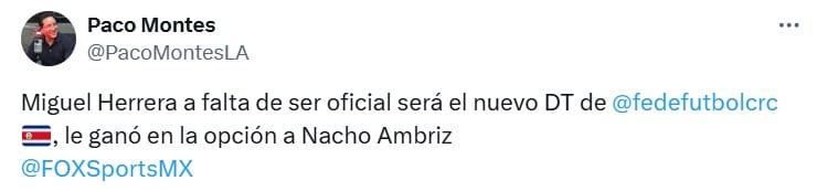 “Miguel Herrera a falta de ser oficial será el nuevo DT de la Selección de Costa Rica, le ganó en la opción a Nacho Ambriz”, escribió el periodista Paco Montes en su cuenta de X.