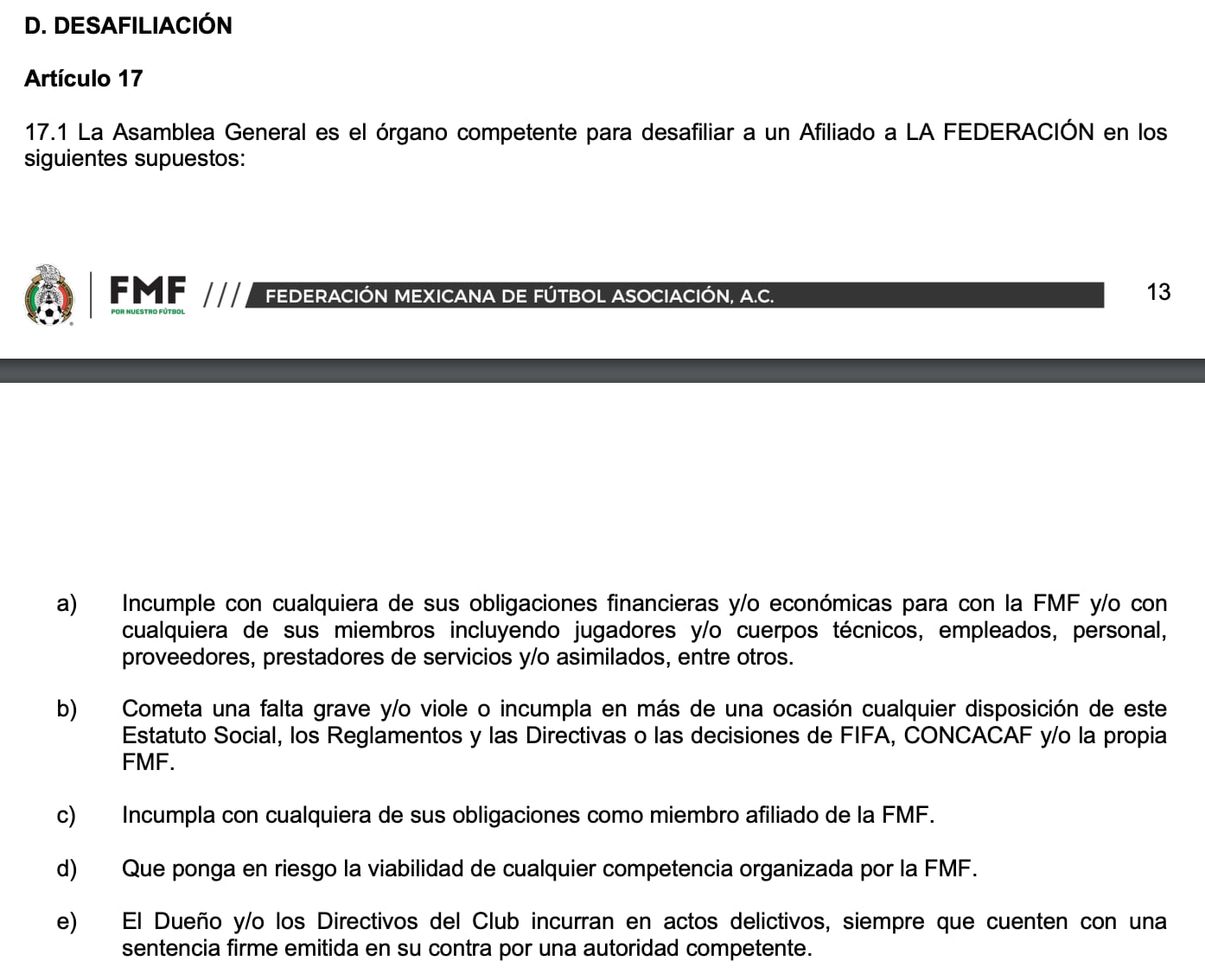 “Artículo 17 17.1 La Asamblea General es el órgano competente para desafiliar a un Afiliado a LA FEDERACIÓN en los siguientes supuestos: