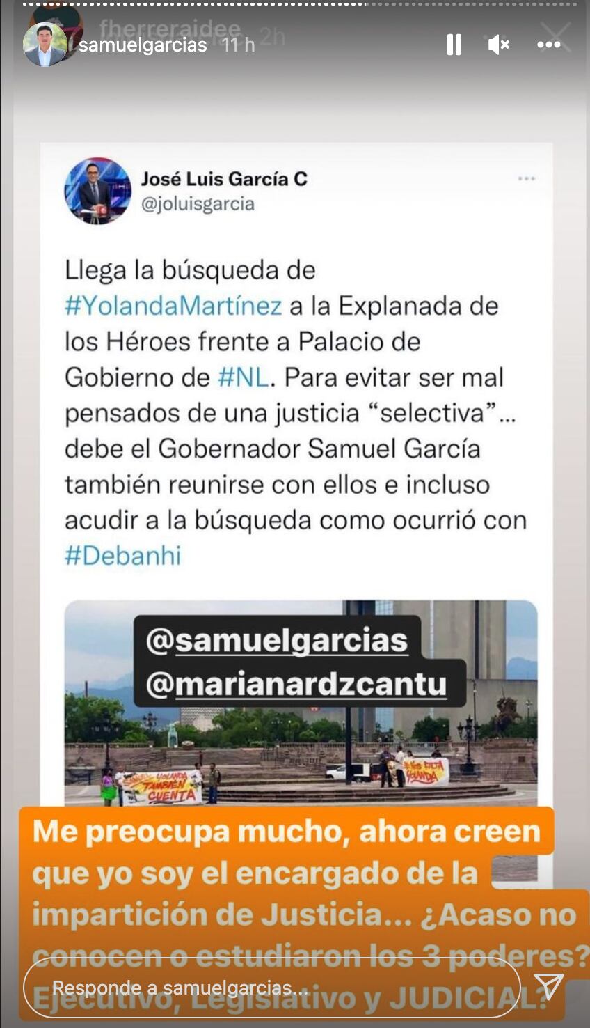 A través de redes sociales, el gobernador Samuel García destacó que su administración está haciendo todo lo posible para dar con ella y con las demás personas desaparecidas en Nuevo León.