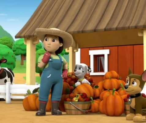 La imagen muestra tanto a Ryder como Marshall en un campo de recolección de calabazas y manzanas para el otoño.
