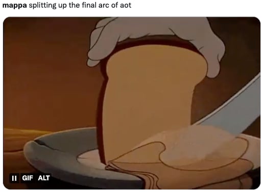 Y ahora que la parte 3 de la Season Final de Attack on Titan se dividirá en dos, los fans piden que ya terminen y paren con su sufrimiento.