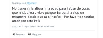 “No tienes ni la altura ni la edad para hablar de cosas que ni siquiera viviste porque Bartlett ha sido un mounstro desde que tu ni nacías. Por favor ten tantito amor por este País”