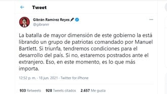 México.- A través de redes sociales, Gibrán Ramírez ha declarado que “la batalla de mayor dimensión de este gobierno la está librando un grupo de patriotas comandado por Manuel Bartlett.”